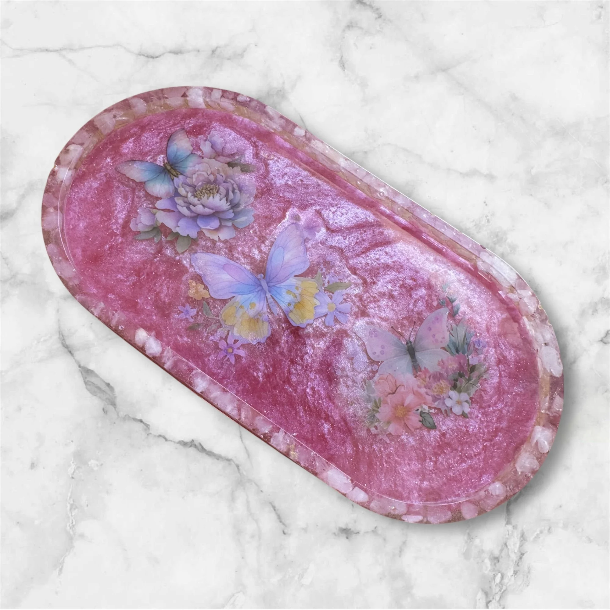 "These handmade pink resin trays are the perfect blend of beauty and function – ideal for jewellery, candles, or coffee table styling. Each one is unique, full of shimmer and swirls, and makes a thoughtful gift for any occasion."